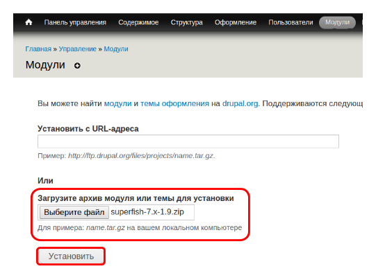 “Модули” → “Установить новый модуль” → загрузить архив или установить через URL → “Установить”: