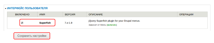 Enable newly added modules → “Интерфейс пользователя” → включить Superfish → “Сохранить настройки”: