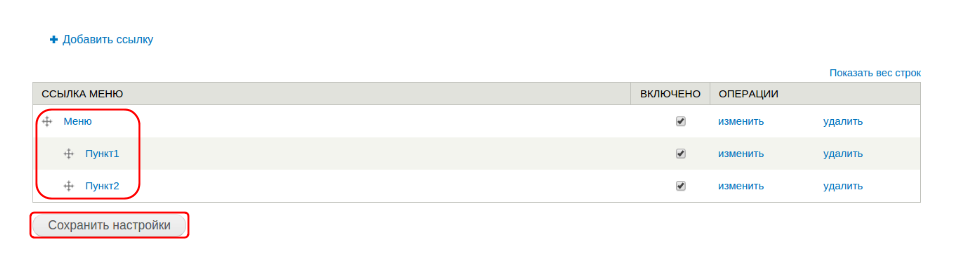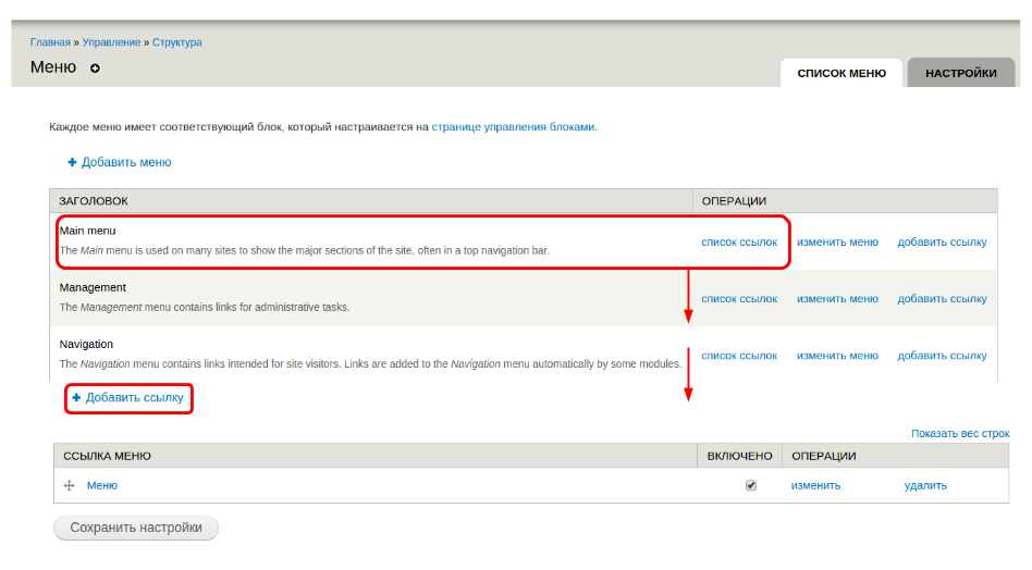 Кликните на кнопку “Настроить”, чтобы озаглавить блок, а также выберите из выпадающего списка область, где блок будет выводиться. Чтобы добавить подпункты, пройдите на вкладку “Структура” → “Меню” → название вашего меню → “Список ссылок” → “Добавить ссылку” → “Сохранить”: