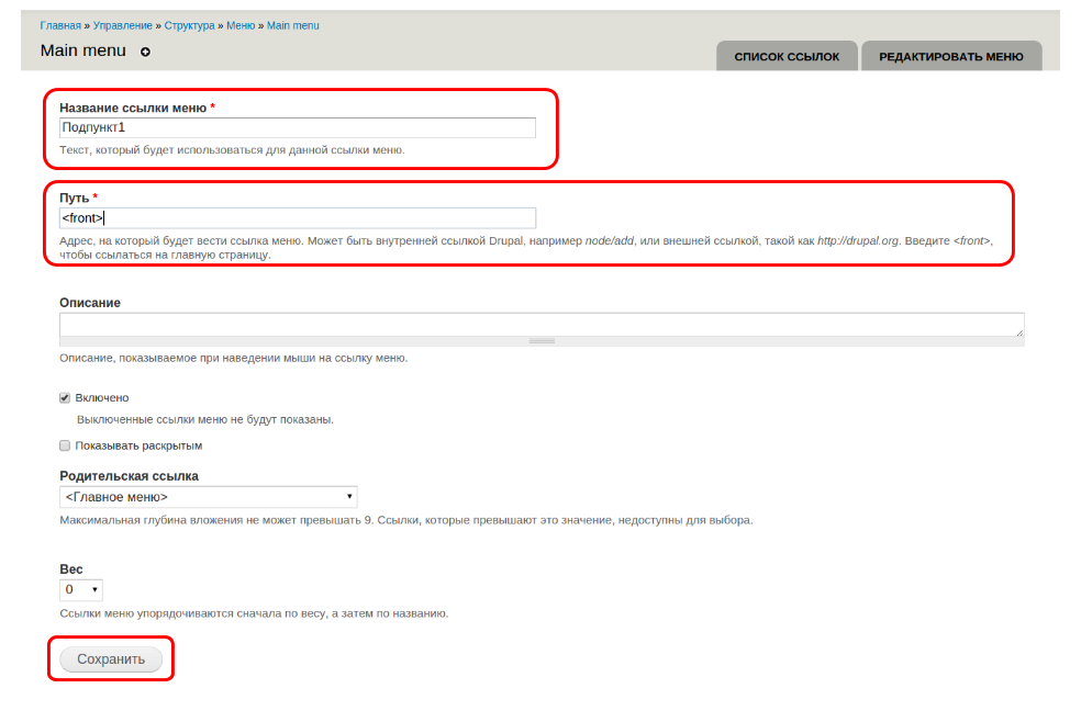 Заполните поле “Название ссылки меню”, а в случае, если ссылки на нужную страницу пока нет, поставьте в поле “Путь” <front>: