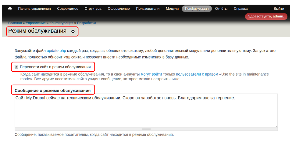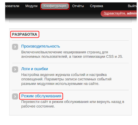 Чтобы включить режим техобслуживания перейдите в “Конфигурация” → “Разработка” → “Режим обслуживания”: