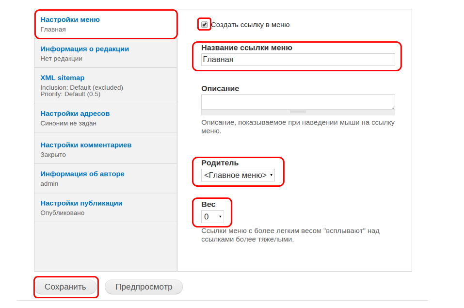 Если вы хотите добавить главную страницу в меню, поставьте галочку напротив пункта “Создать ссылку в меню” и заполните поле “Название ссылки меню”. В блоке “Родитель” отметьте “Главное меню”. “Вес” отвечает за порядок вывода ссылок ー ссылки с меньшим весом идут первыми: