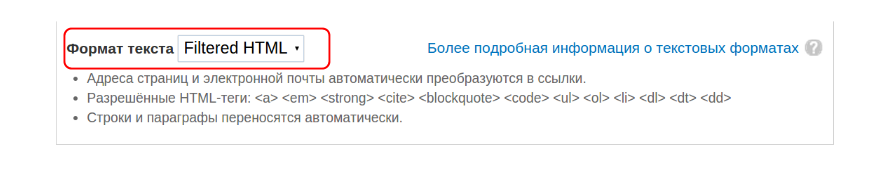 Пункт “Формат ввода” отвечает за способ ввода содержимого: Filtered HTML, Full HTML и Plain text: