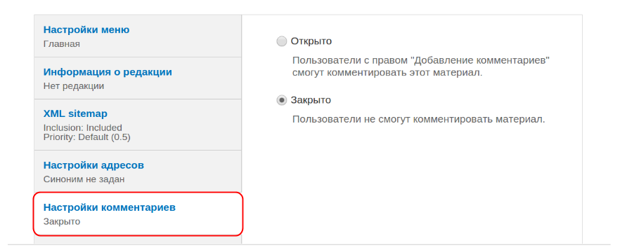 В блоке “Настройка комментариев” включаются/отключаются комментарии: