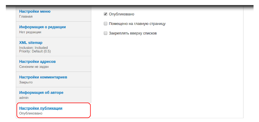В блоке “Настройки публикации” можно опубликовать страницу, поместить на главную или закрепить вверху списков: