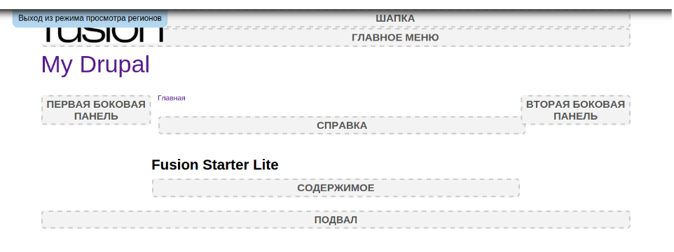 Зайдите в “Структура” → “Блоки” и здесь вы увидите перечень существующих включенных и выключенных блоков. Каждый из них относится к своей области. Чтобы увидеть “карту” блоков, кликните на ссылку Demonstrate block regions (Fusion Starter Lite):