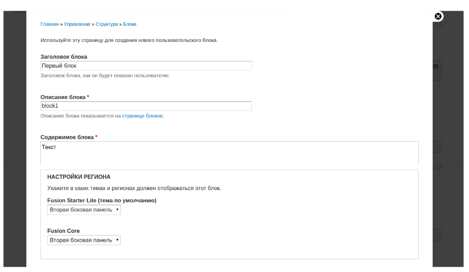 Чтобы создать свой блок выйдите из режима просмотра регионов и кликните на ссылку “Добавить блок”. В поле “Заголовок блока” (отображается на сайте) впишите название, также заполните поля “Описание” (отображается в админпанели) и “Содержимое блока”. В разделе “Настройки региона” выберите область, в которой будет отображаться новый блок: