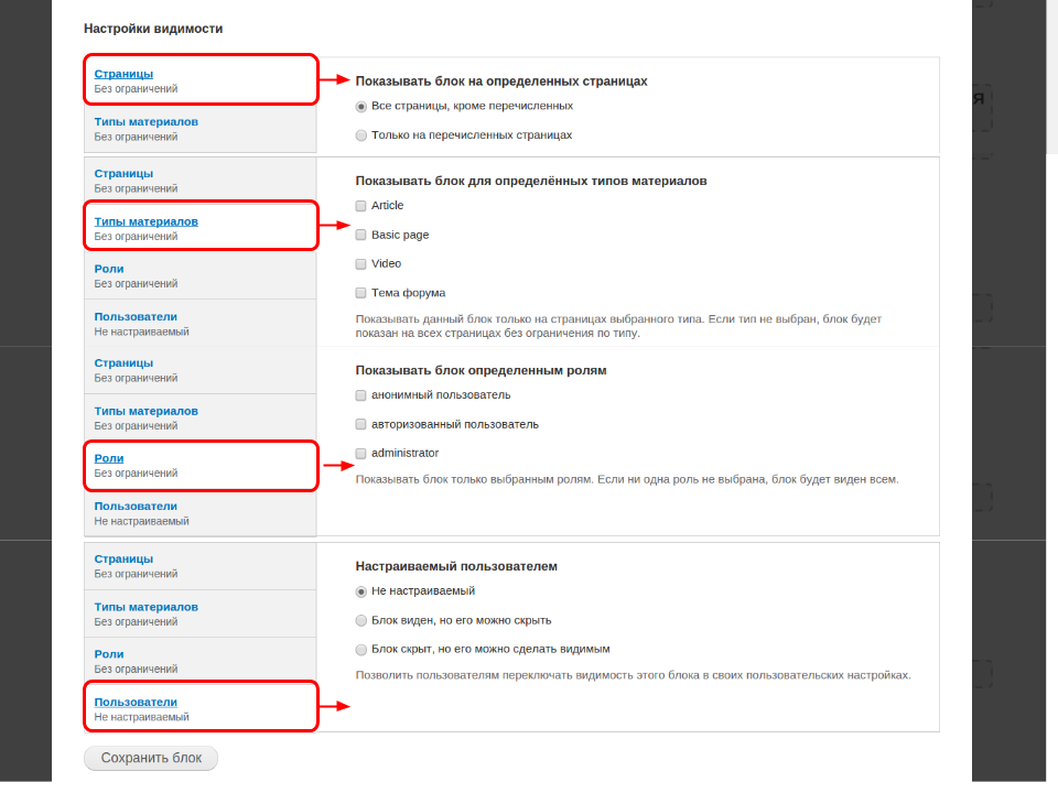 В разделе “Настройки видимости” выберите, на каких страницах и типах материалов будет отображаться блок, кто сможет видеть блок, возможность переключать видимость блока для посетителей. Сохраните изменения: