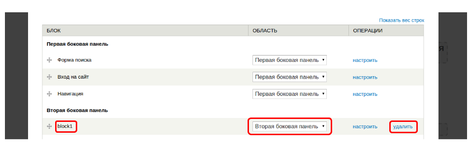 Чтобы изменить регион блока или удалить его, перейдите в “Структура” → “Блоки”: