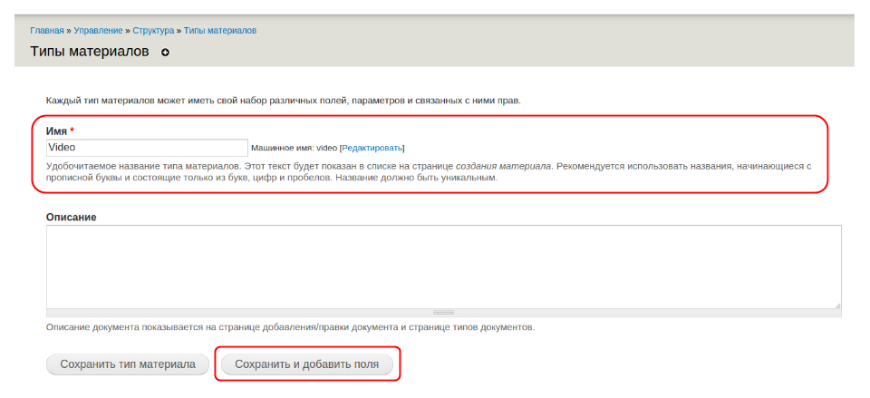 Теперь, когда вы установили новый модуль, подключите его и Video Embed Field , а затем перейдите в “Структура” → “Типы материалов” → “Добавить тип материала” → “Имя” → ”Сохранить и добавить поля”: