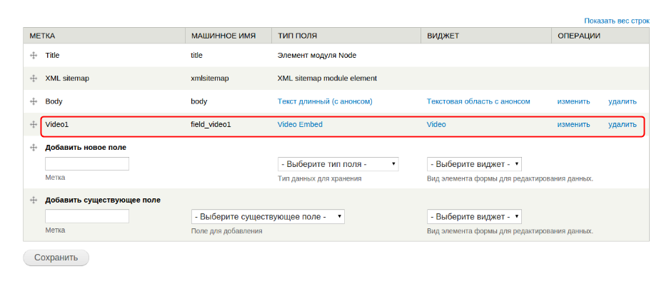 Заполняете полу Title, Video URL (копируете адрес видео скопируйте в адресной строке), добавьте описание в полу Body и нажмите “Сохранить”: