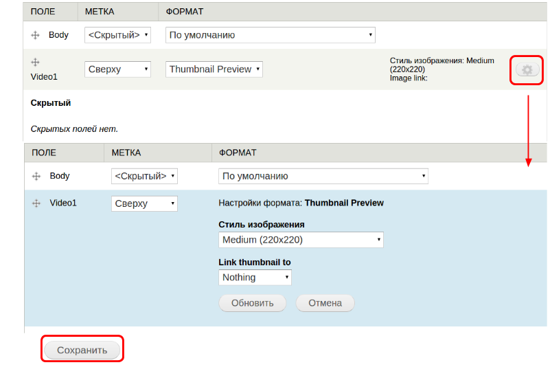 “Структура” → “Типы материалов” → Video → “Управление отображением” → “Формат” (Thumbnail Preview/Video Player/Url to video):
